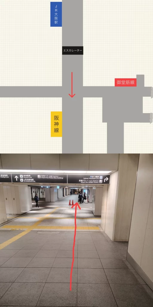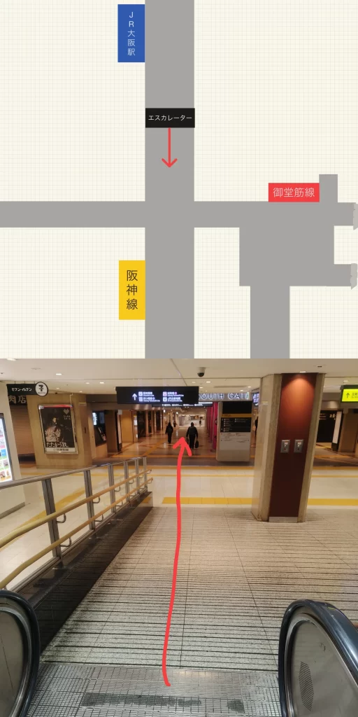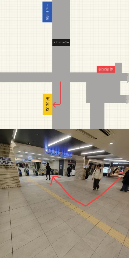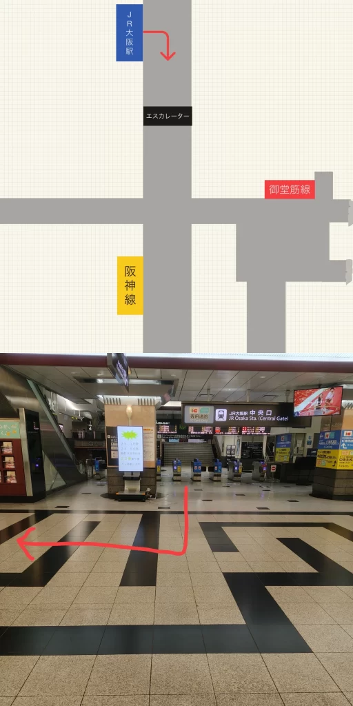 JR大阪駅から阪神梅田駅までの最短ルートはJR大阪駅の中央口改札から阪神梅田駅の百貨店口改札を使う乗り換えです。