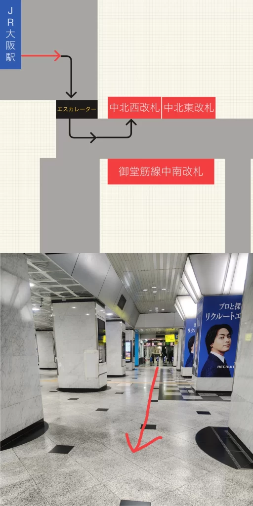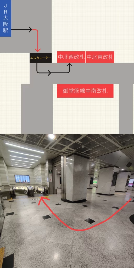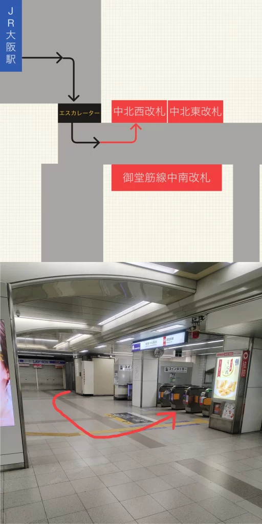 JR大阪駅から御堂筋線梅田駅までの最短ルートはJR大阪駅の御堂筋口改札から御堂筋線梅田駅の中北西改札を使う乗り換えです。