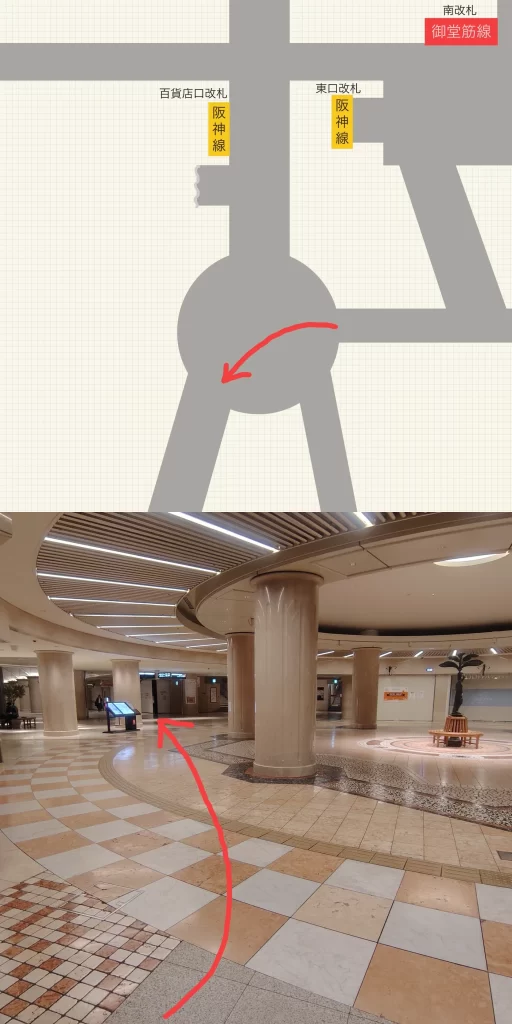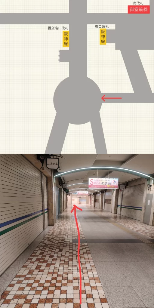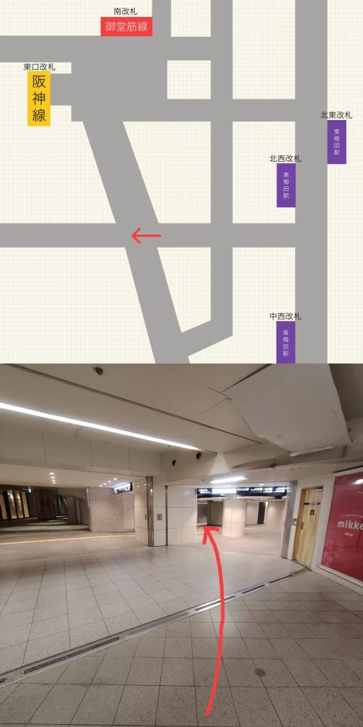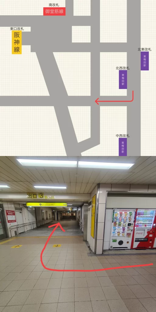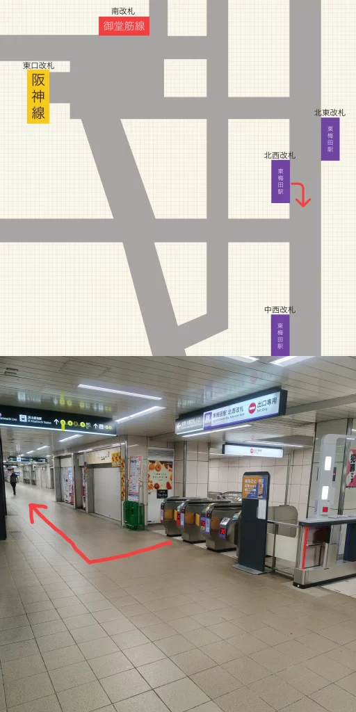 ①まずはじめに谷町線東梅田駅の北西改札を出て右に曲がります。