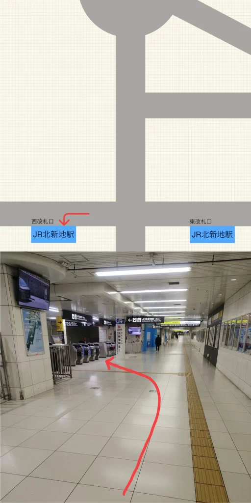 ⑩まっすぐ進んで行くと左手に改札があります。ここでJR北新地駅の西改札口に到着です。
